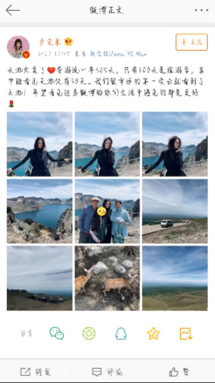 近日,高晓松31岁的前妻夕又米在网上发布了一组照片,分享她和父母女儿的旅游照,配文直言自己很幸运,“导游说一年365天,只有100天使旅游季,其中能看见天池仅有30天。我们很幸运的第一次去就看到了天池!”