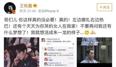 连歌手王栎鑫都发微博称,“想把自己变成朱一龙”,还提到自己的老婆最近疯狂迷恋朱一龙,搞得自己很是吃醋,非常嫉妒这位优秀的演员。