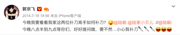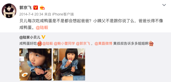 贝儿发微博说吃了咸鸭蛋,然后郭京飞就调皮地转发微博,“贝儿每次吃咸鸭蛋是不是都会想起爸爸?小姨父不是跟你说了么,爸爸长得不像咸鸭蛋”,这么调皮的一个小姨夫,难怪贝儿想把他关起来。