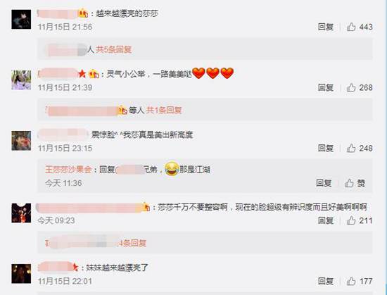 王莎莎微博下的评论也是一边倒地震惊脸,还有小伙伴很是关心地留言:莎莎千万不要整容啊,现在的脸超级有辨识度而且好美啊啊