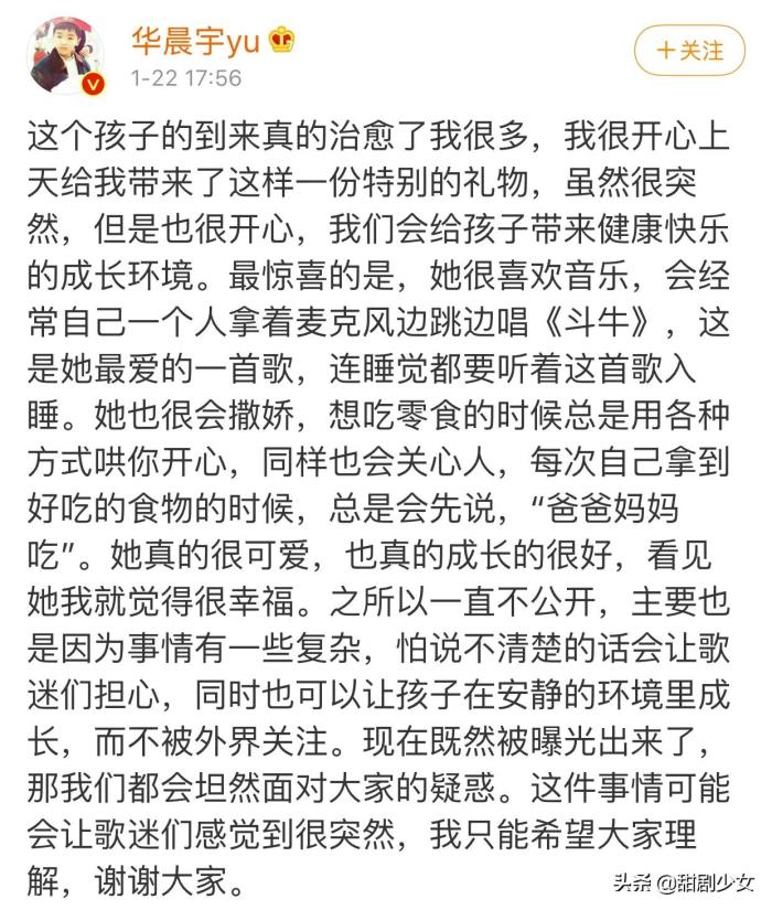 今天下午,华晨宇微博发文:“是的,我们是有一个孩子。”