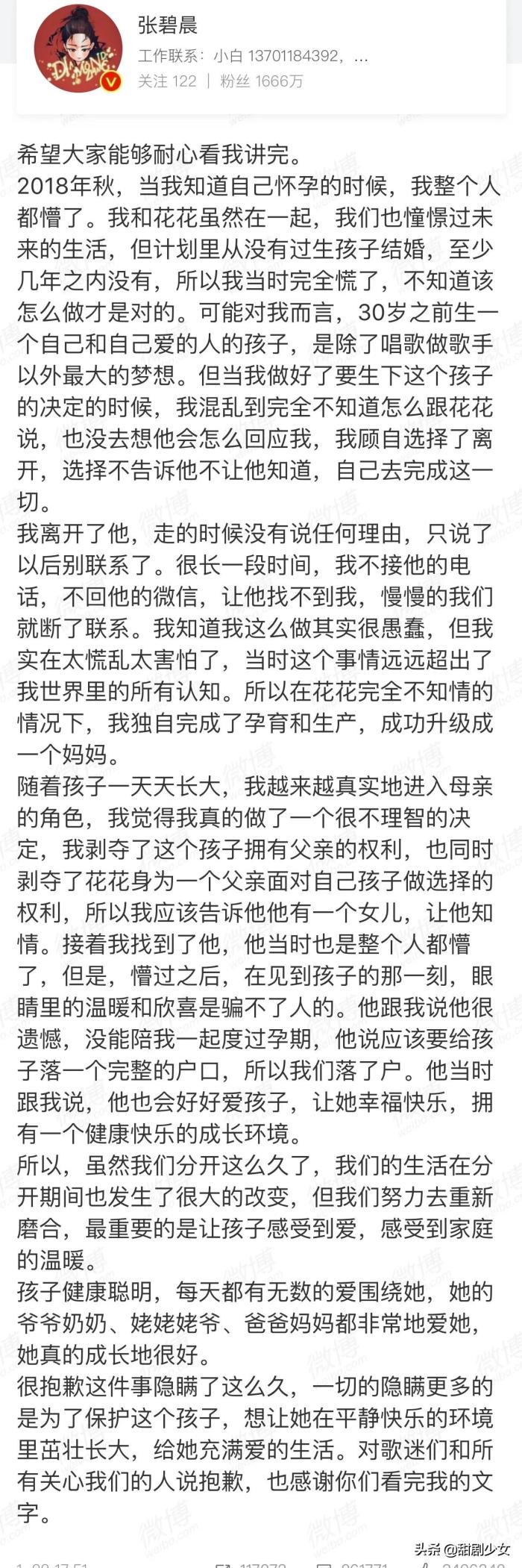 紧随其后,张碧晨也通过长文微博证实此事。张碧晨表示,自己在2025年秋怀孕的时候,整个人都懵了,因为不想影响花花就顾自选择离开。