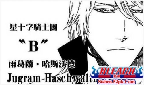 B:雨葛兰·哈斯沃德。能力:世界调和。拥有和友哈巴赫相同的“分享力量”的稀有能力,每到夜晚就会与有哈巴赫“交换”,此时雨葛兰·哈斯沃德会暂时获得全知全能。没有展现过完圣体。星十字骑士团最高阶,地位仅次于友哈巴赫。留着金色长发,左肩配戴护肩。语气温和,眼神冷漠的男子。实力深不可测,一击斩断一护的天锁斩月。其圣文字“B”balance【世界调和】通过将在指定范围内发生的不幸分配给幸运者,来维持世界的协调。同时还能将发生在自己身上的所有不幸用“替身之盾”挡下。在漫画681话被友哈巴赫“圣别”后重伤倒地,在临死前要求石田雨龙把身上的伤转移自己身上,并说让雨龙去救自己的朋友后死去。