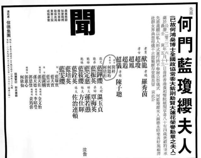 鉴于二太蓝琼缨生前便行事低调,所以其去世后的葬礼各项事宜也都简化处理,一切都由长女何超琼亲自打理,而何超琼遵循母亲遗愿并未设置公祭仪式,也宣布不收帛金及花圈,恳请有心人将帛金捐赠给慈善机构,所以媒体一路追踪也没得到更多相关消息,目前也只对外公开了讣告。