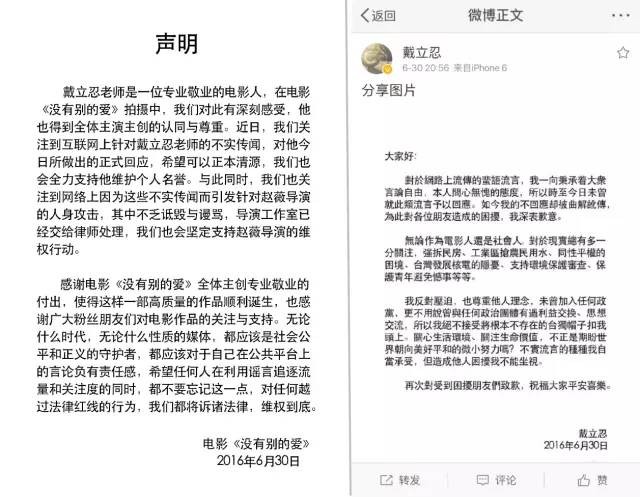 电影《没有别的爱》及戴立忍公开声明