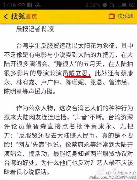 其实,要想反驳自己是台独分子,对戴立忍包括《没有别的爱》的投资方还有赵薇来说,都是非常简单的一件事,只要戴立忍从“我是中国人”/“台湾属于中国”/“两岸同属一个中国”这三句里任选一句,然后在自己的微博上重复一遍,那么,现在网络上所有关于戴立忍是台独分子的指责都会落空。