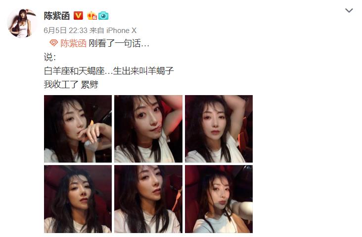 虽然目前陈紫函和戴向宇本人均未对此有所回应,不过,陈紫函昨天发布的一条微博倒是引起了小编的注意,当时,陈紫函发文称:“刚看了一句话…说:白羊座和天蝎座…生出来叫羊蝎子 我收工了 累劈 ”