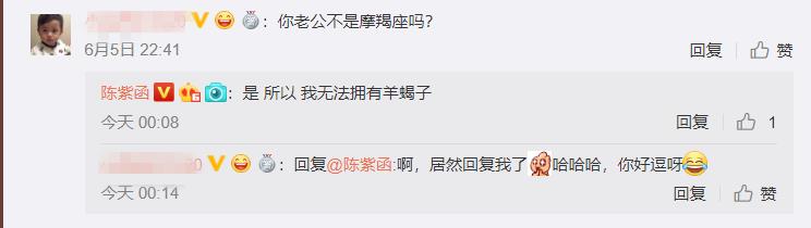同为山羊座的陈紫函突然这么说,显然是意有所指,不过,很可惜的是陈紫函的老公戴向宇在资料中却显示是魔羯座,因此,有网友也在评论中这样询问,对此,陈紫函则回应道:“是 所以 我无法拥有羊蝎子”