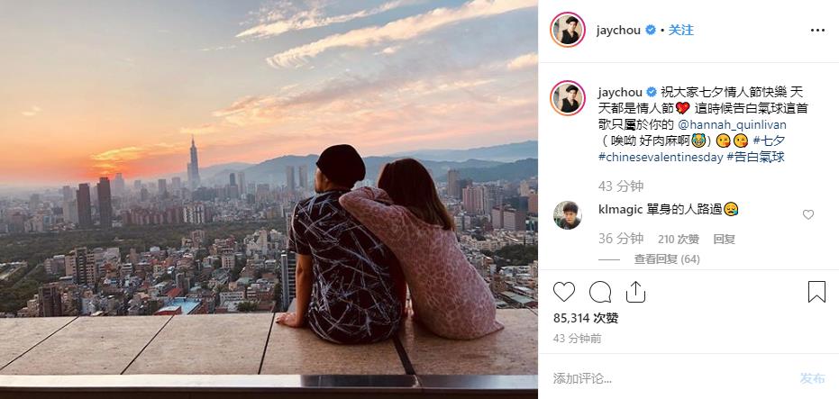 8月7日,农历七月初七是中国传统节日七夕节,周杰伦在个人社交网站上上传了与老婆昆凌的合照,并附文:“祝大家七夕情人节快乐,天天都是情人节!这时候《告白气球》这首歌只属于你的@昆凌 (唉呦 好肉麻啊!)”照片中,昆凌长发披肩,穿一身粉色豹纹连衣裙,倚靠在杰伦背上。两人一同坐在高处望向同个地方看风景,恩爱甜蜜。