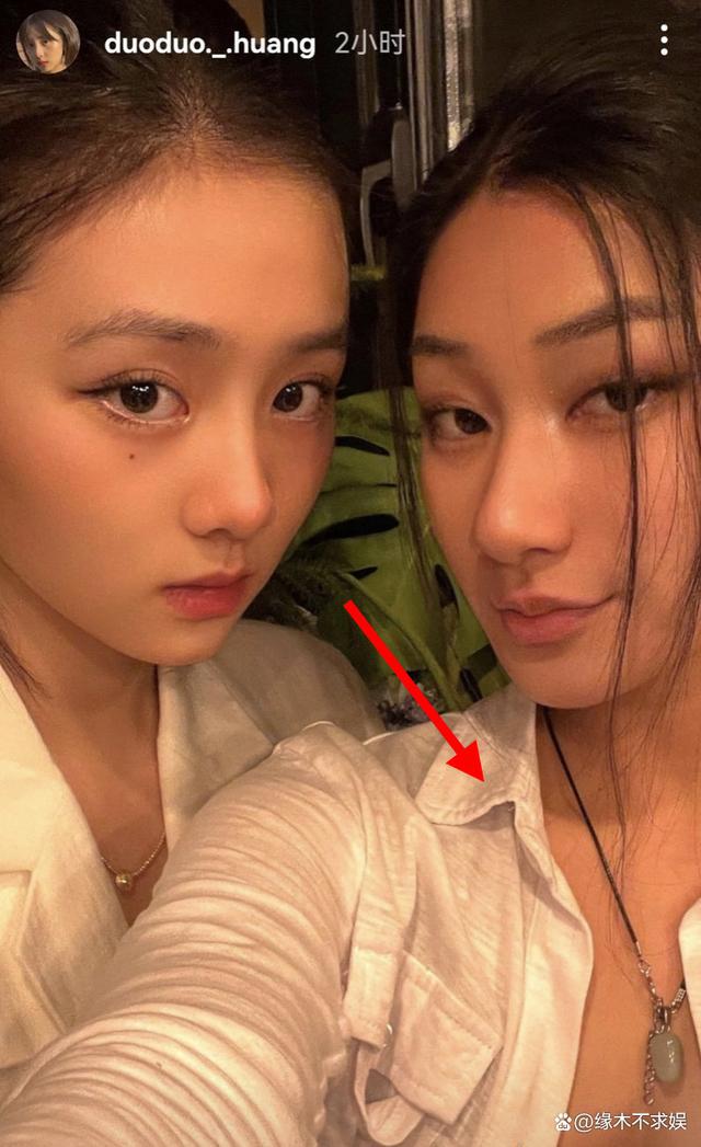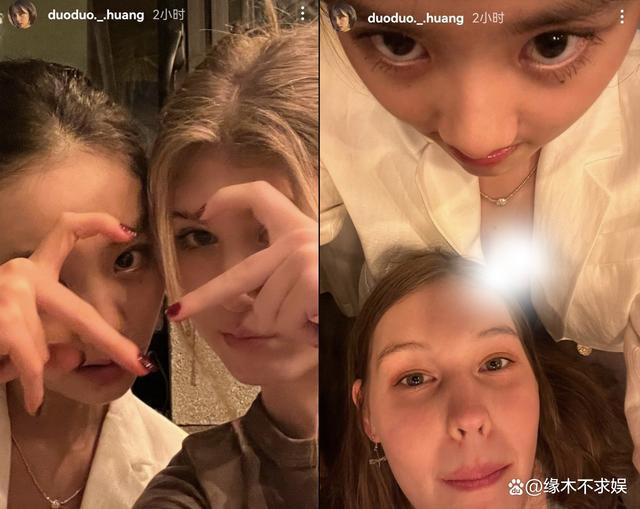 2 月 5 日,黄多多晒出了同学的合影,两人都穿着白色的衬衫,妆容精致。和黄多多尚显稚嫩的小脸蛋相比,同学修长的脸型、烟熏的妆容更显成熟的多。且同学的领口也是敞开的,看上去比黄多多大胆得多。