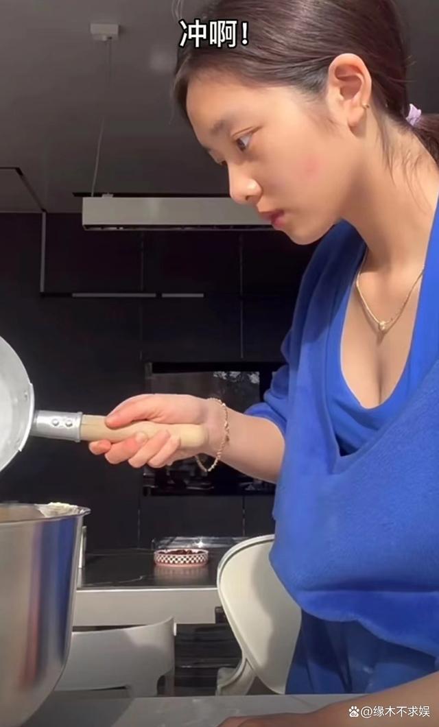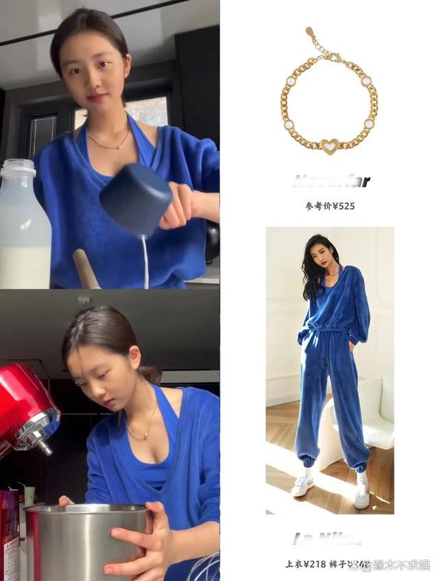黄多多曾晒出一则做泡芙的视频,视频中她穿着蓝色的运动套装认真的打着奶油,但因为领口太低引发王涛吐槽。这件衣服同款也被网友扒出,不少博主纷纷 get 了同款——