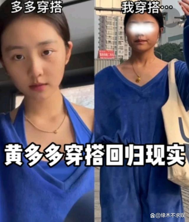 博主晒出和黄多多的穿搭对比,配上标题 " 当黄多多穿搭回归现实 "。在黄多多身上青春洋溢的穿搭,在博主身上似乎略显黯淡。仔细一看,博主只是单穿,黄多多还在里面加了背心,已经很是小心保守。