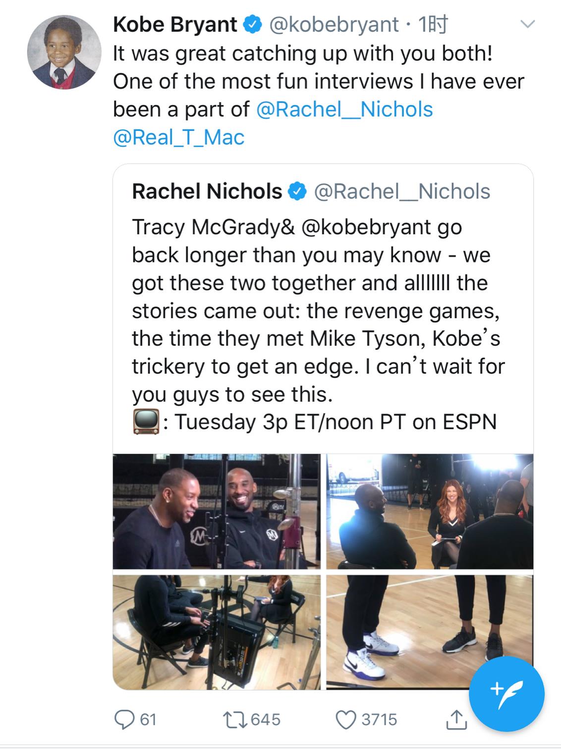 著名NBA记者兼主持人Rachel Nichols发推,晒出采访科比和麦迪两人的场景。科比随后转推并写道:“很高兴遇见你们俩!这是我参加过的最有趣的采访之一。@Rachel__Nichols@Real_T_Mac。”据悉,这次采访将会于美国东部时间明天下午三点播出。