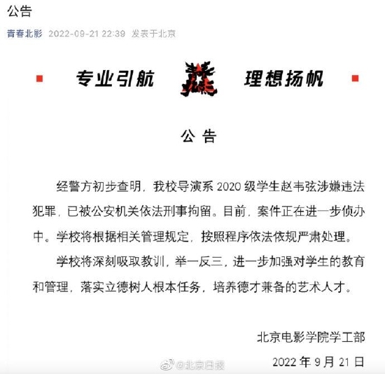 【北电回应赵韦弦被刑拘:严肃处理】据青春北影微信公众号,经警方初步查明,北京电影学院导演系2020级学生赵韦弦涉嫌违法犯罪,已被公安机关依法刑事拘留。目前,案件正在进一步侦办中。学校将根据相关管理规定,按照程序依法依规严肃处理。