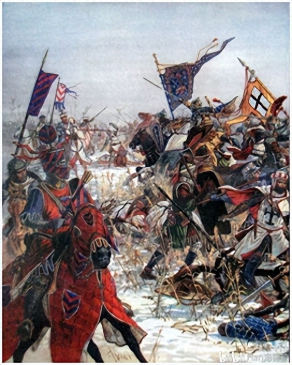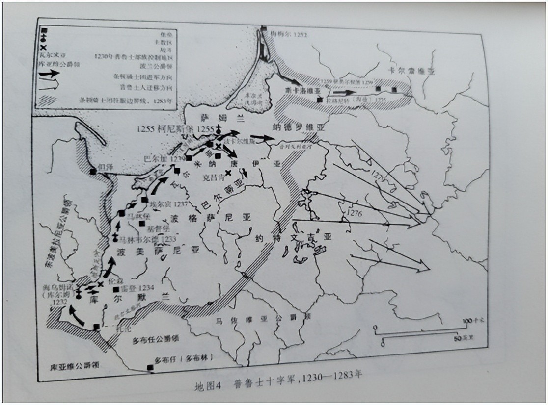 条顿骑士团很快向普鲁士人操起屠刀,1230年,条顿骑士团最著名的英雄赫尔曼·鲍克 率领一支 由20名骑士、200名士兵组成 的先遣队,开进了库尔姆,拉开了对普鲁士地区的征服序幕。到1236年,经过6年的战争,他们 已经突入到维斯瓦河三角洲地带。条顿骑士团借鉴 了宝剑骑士团的征服经验,沿河构筑了许多城堡并将其连成一线,骑士团以这些城堡作为依托,准备沿着波罗的海海岸向东面的涅曼河推进。在利沃尼亚骑士团与条顿骑士团合并后,条顿骑士试图安抚丹麦王瓦尔德马尔二世,瓦尔德马尔仍然坚决要求归还他在爱沙尼亚 的地盘。“1238年,双方根据16年前最初的瓜分方案达成一致 爱沙尼亚仍置于罗马教廷 的保护下,丹麦分得 了爱沙尼亚 北部地区,而条顿骑士团得到了原宝剑骑士团所占领的南部地区。1240年-1246年,条顿骑士团与但泽公爵爆发战争,最后,在教皇特使的调停下,但泽公爵和条顿骑士团达成协议,他们共同控制维斯瓦河三角洲地区。1260年,普鲁士爆发 了反抗条顿骑士 团的起义,普鲁士人在当地头领 的带领下,不断向骑士团的城堡进攻。起义者杀死了许多驻留的骑士和日耳曼移民,条顿骑士 被迫龟缩在城堡里 无法行动,骑士团几乎被逐出普鲁士。在十字军的帮助下,条顿骑士花了整整七年时间才镇压了起义。普鲁士人被击溃,残部向条顿骑士投降,皈依天主教,到了1280年,条顿骑士团完成控制普鲁士地区,普鲁士也逐渐被同化。