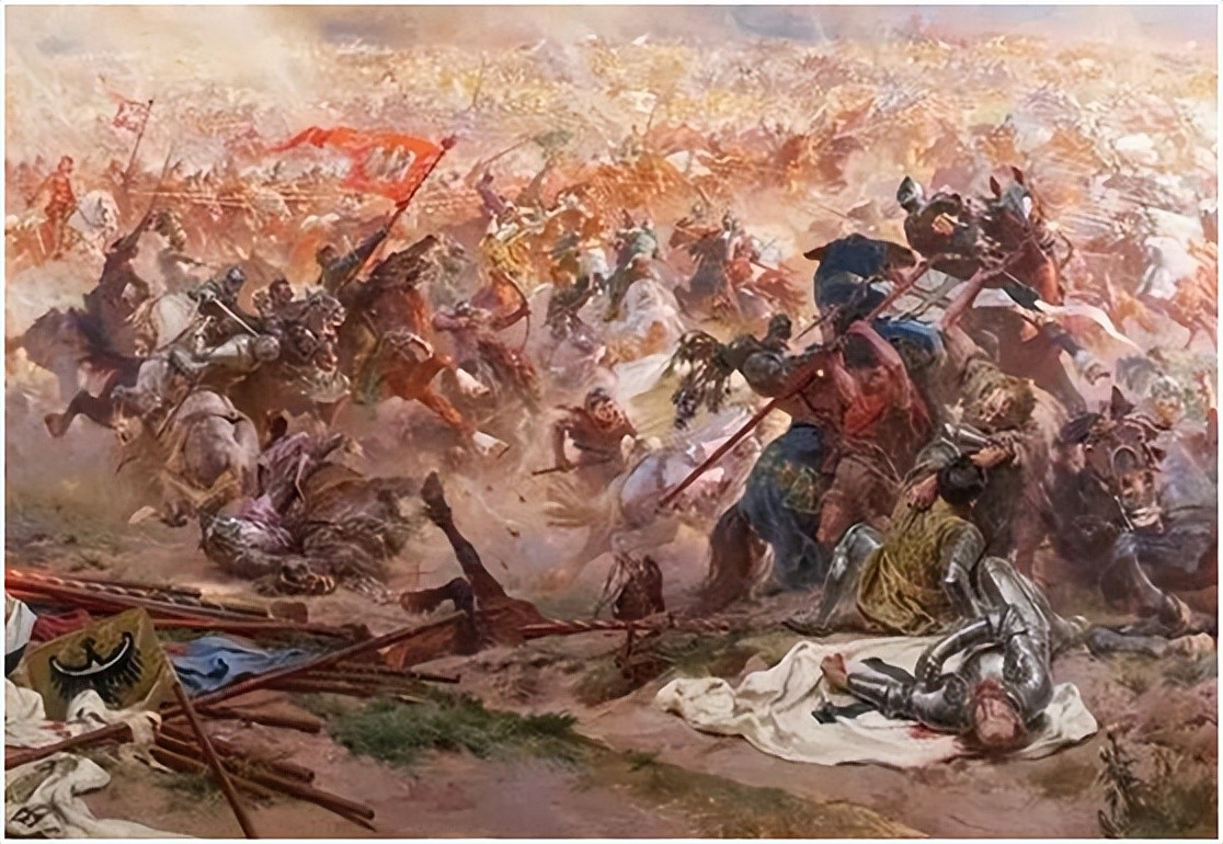 39000人的波兰——立陶宛联军对阵27000人的条顿骑士团。两军开战,两军都占据有利地形。互相对峙,互不相让,都想让对方先进攻,彼此僵持在一起。期间,条顿骑士放炮,但是因为距离较远,天降小雨,没打死几个人。但是,联军右翼的立陶宛人遭受炮击,终于按捺不住,疯狗一样向条顿骑士阵地冲去。在贵族骑兵冲锋之余,灵活的鞑靼弓骑兵也企图在侧翼进行保持支援。但他们都遭到了骑士团骑士的严厉反击,第一线攻击迅速溃退,外围的鞑靼骑兵也被骑士团步兵长弓手和弩手的支援火力击退。不甘心的立陶宛与鞑靼人又发起了第二线攻击,同样被击溃。条顿骑士冲锋,立陶宛军大败,许多步兵被条顿骑士活活踩死,立陶宛骑兵开始败退。条顿骑士左翼见状发起追击,击退立陶宛人,包抄波兰军。条顿骑士团大团长容金根见状,命令全军一起压向波兰军,妄图一举击溃波兰军。波兰军抵挡不住,节节败退。但是,波兰骑士顽强抵抗,拼死挡住条顿骑士的攻击,两军缠斗在一起,条顿骑士始终未能击溃波兰军。但波兰军也逐渐不支,败象已露。就在这时,败退的立陶宛人在维陶塔斯的激励下,重新组织起来,返回战场,包抄正在猛攻波兰军的条顿骑士后方。条顿骑士没想到立陶宛人杀个回马枪,忽然遭到两面夹击,士气大跌,混战中,大团长容金根被立陶宛骑兵一矛刺死。见团长战死,条顿骑士终于抵挡不住,崩溃,波兰——立陶宛军追击,条顿骑士大败,溃散。波兰——立陶宛获胜。