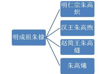 明成祖朱棣一共有四个儿子,长大成人三位,夭折一位,分别是明仁宗朱高炽、汉王朱高煦、赵简王朱高燧、朱高爔。