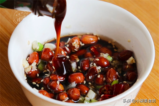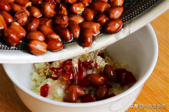 7、然后把油和花生米一起倒入料碗里。把料头爆香,然后用筷子先搅拌均匀,使调料受热均匀。