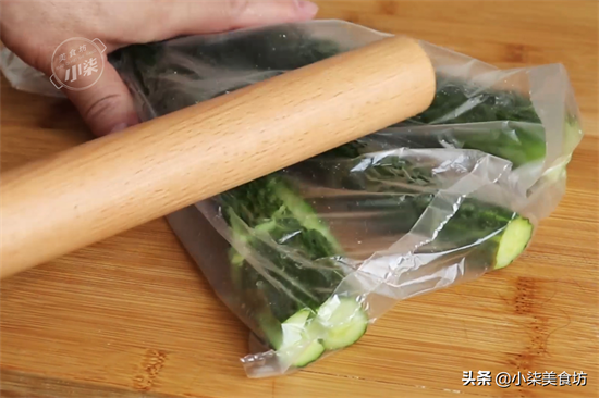 2、然后把洗干净的黄瓜去头去尾。再准备一个保鲜袋,把黄瓜装进保鲜袋里。然后用擀面杖敲一敲,把黄瓜拍扁。