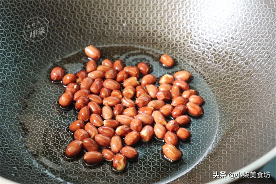 6、然后凉锅凉油下入一把花生米,开中小火慢慢炒,把花生米炒香,炒至花生米变色,并且能听到噼里啪啦的声音,像这样就可以了。