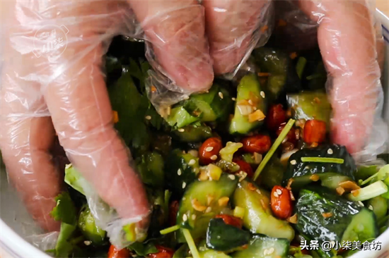 11、然后用手把黄瓜拌均匀。这样拌凉菜味道更均匀。拌好之后装盘就可以开吃啦。