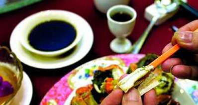 用双手将蟹身用力掰开,蟹身横截面上的蟹黄/膏吸食之,然后将手指抓住蟹腿根部沿蟹身纹理撕下蟹身段,蘸醋姜食之,或用牙签挑取蟹身肉食之。