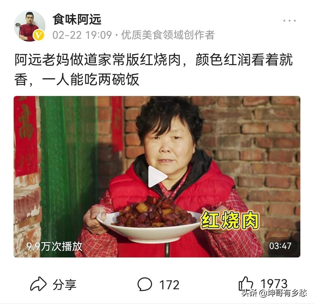 百度搜索“食味阿远”是哪里人,点赞量最多的一个答案说:“食味阿远是河北石家庄人。目前美食类视频里最好的之一。他的视频比较单纯接地气,就是不停的做美食然后一家人品尝。并且对于食材很舍得下本投资,基本上一个视频一顿饭的成本就得100-200左右,每期的视频都是自己买菜自己做。而且他自身的厨艺也是很不错的,看他的视频可以学到很多做菜尤其是做肉的方法,阿远做的菜普通网友学起来能容易一些。”这个答案应该是从侧面反应了网友对“食味阿远”的认可。也印证了真正的美食视频还是有一定的忠实粉丝的,重要的是,就是网友有类似这样的认知,才让“食味阿远”在头条上有了接近170万的粉丝群体,成了名副其实的网红大V。