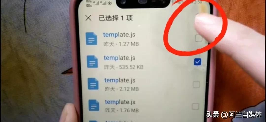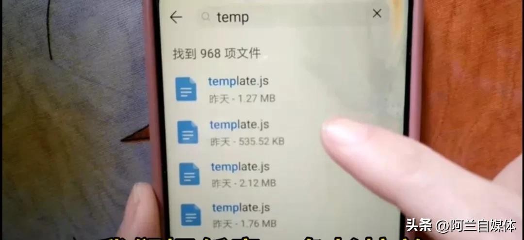 我们把搜索框点一下后,在上方输入temp,在下方出现了九百多项的文件。我们把任意一条长按着,然后看上方这里有一个全选按钮,把它点击一下全文上,然后点下方“删除”,立刻就删除了。这是手机里面的临时文件,都是没用的。