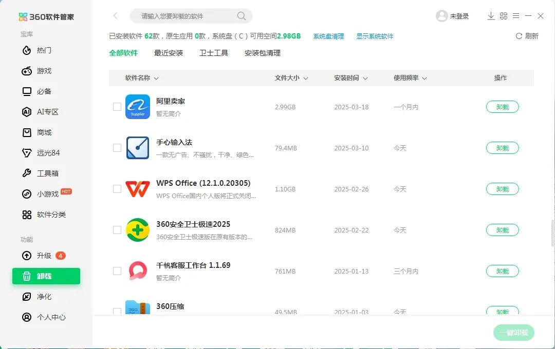 1、打开360软件管家,点击左边功能区的卸载,找到360安全卫士极速版,点击“卸载”。