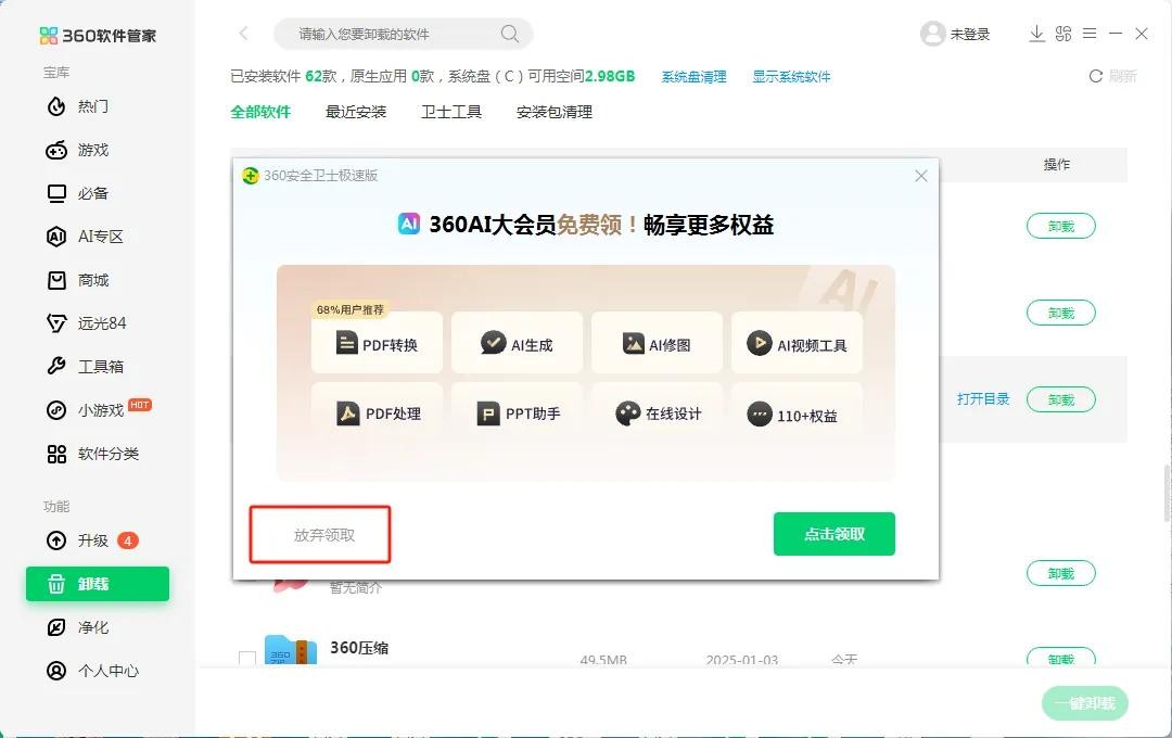 2、此时会弹出一个界面:点击“放弃领取”,如果选择点击领取,卸载程序会自动终止。