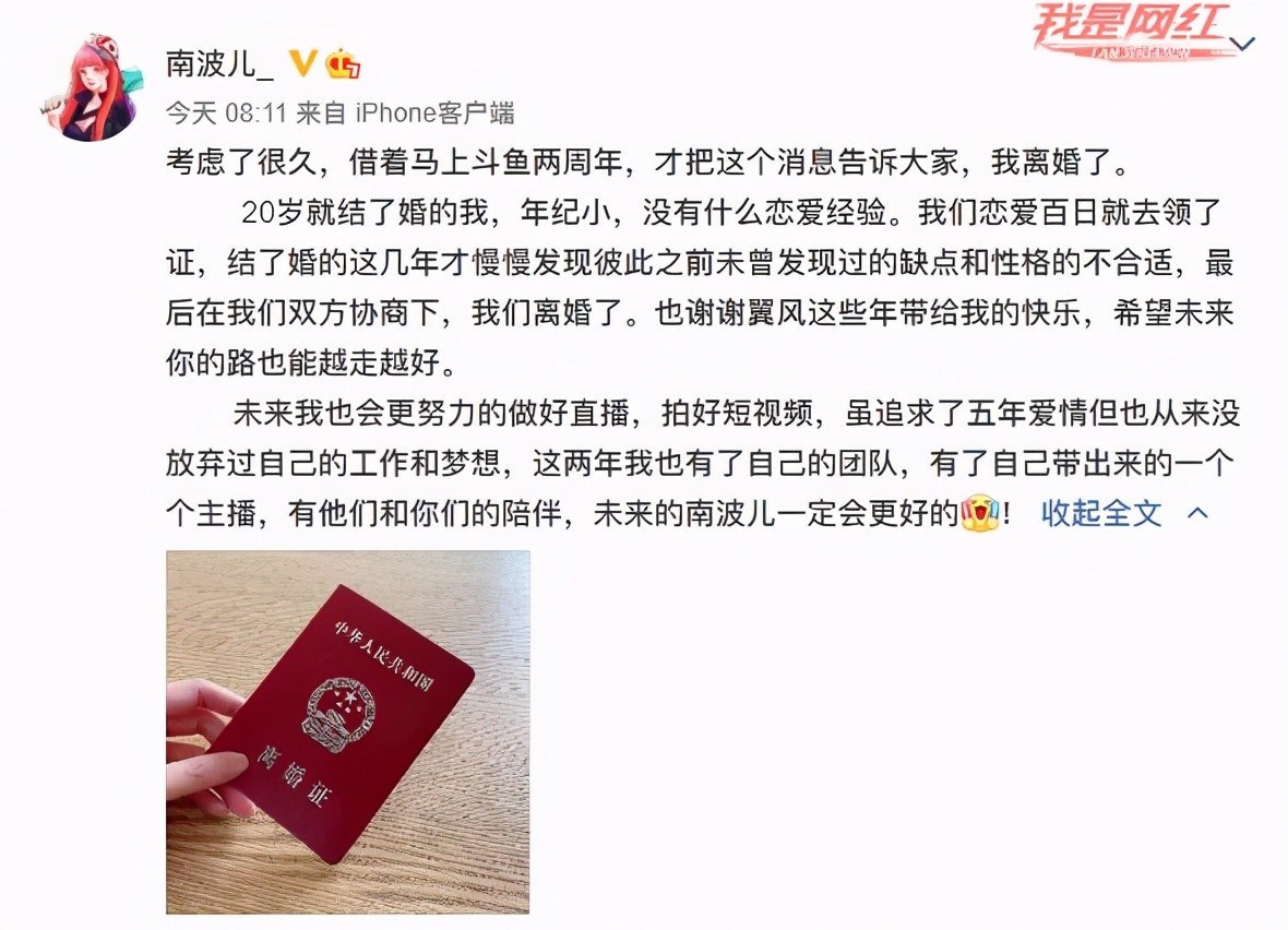 斗鱼南波儿宣布离婚,恋爱百日就裸婚了,但彼此性格不合