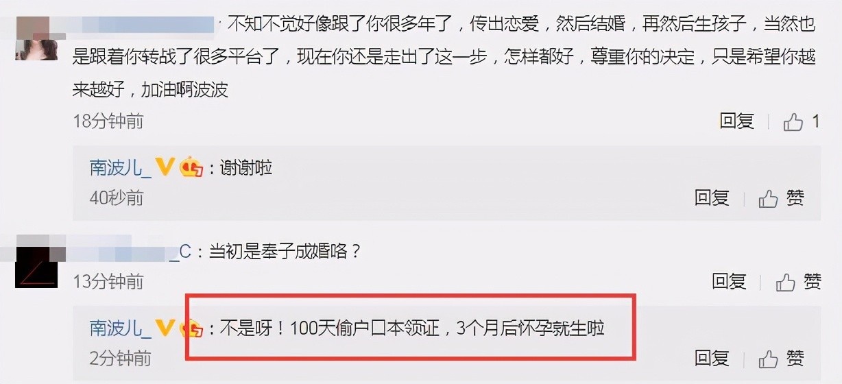 有不少粉丝也大胆留言问题,还以为南波儿当初是奉子成婚,当事人也出来回应,原来不是!经历了100天的恋爱,就偷家里的户口本去领证(错误示范),三个月后才怀孕生子。个人猜测,南波儿的家人是有点反对,又或者是南波儿瞒着家人结婚,不然也不会去偷户口本领证,还是年少轻狂,现在便付出了代价。当代年轻人千万不要模仿,不然你就是可能是下一个南波儿,现在南波儿的孩子也挺大了,估计已经在读幼儿园,也可怜这个孩子,要生活在一个单亲家庭中。