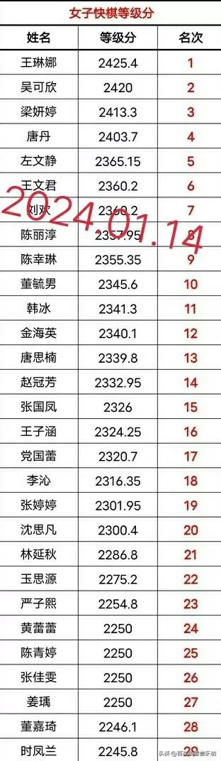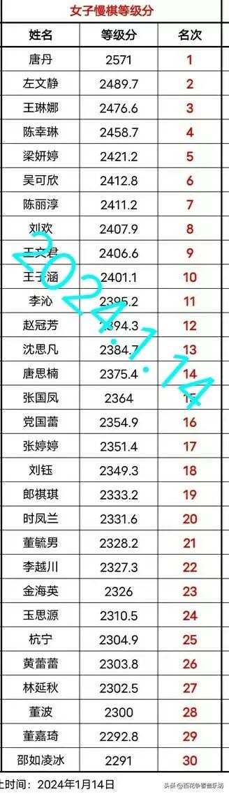 根据中国象棋协会2024.1.14的最新公布的数据:女子棋手慢棋最新等级分如下:(暂列前12位,后略见图示)