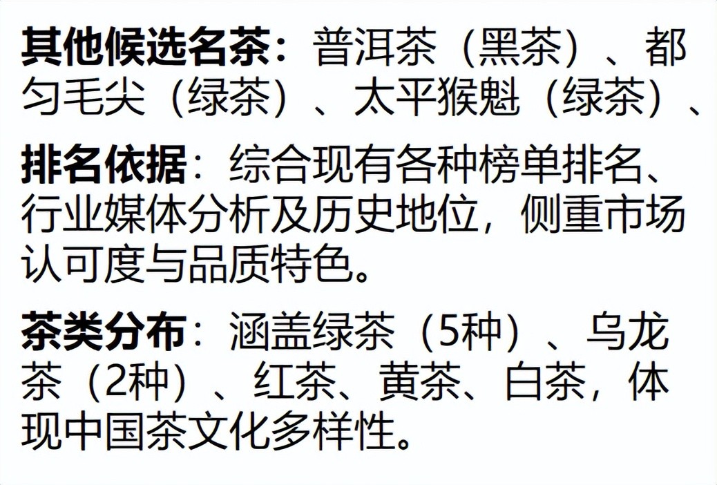 其实,中国的好茶名茶太多太多,就算写前100名也写不完。茶文化是老祖宗给我们中华民族留下的文化瑰宝,需要我们一代代人去珍惜和发扬光大。切不要让可乐、咖啡这些舶来品以及越来越不像茶的现代奶茶,对我们自己民族的历史文化发展带来严重影响...#茶##茶叶##茶文化##饮品##排名##历史##文化##民族##习俗##家乡##品牌##饮料##热点##新闻##社会##财经#