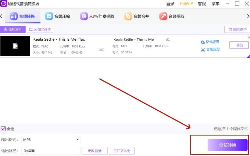 步骤2,设置flac音频输出格式设置为“mp3”,然后点击“转换”。