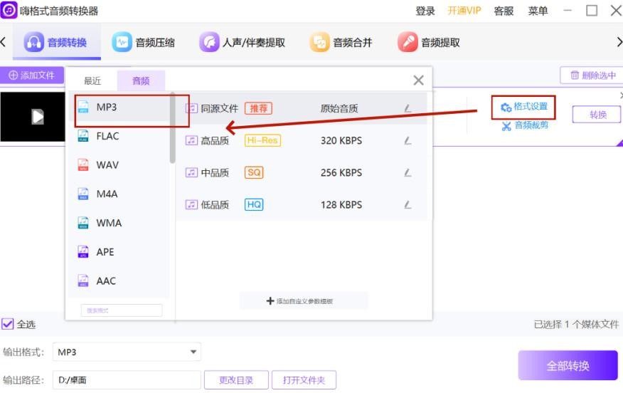 步骤2,点击“格式设置”将flac音频设置成MP3格式。
