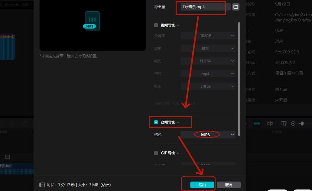 步骤3,设置文件存储位置和“MP3”格式类型,最后点击“导出”即可。