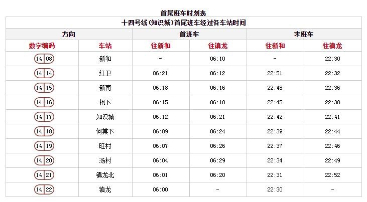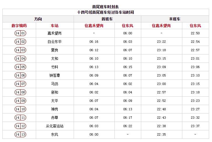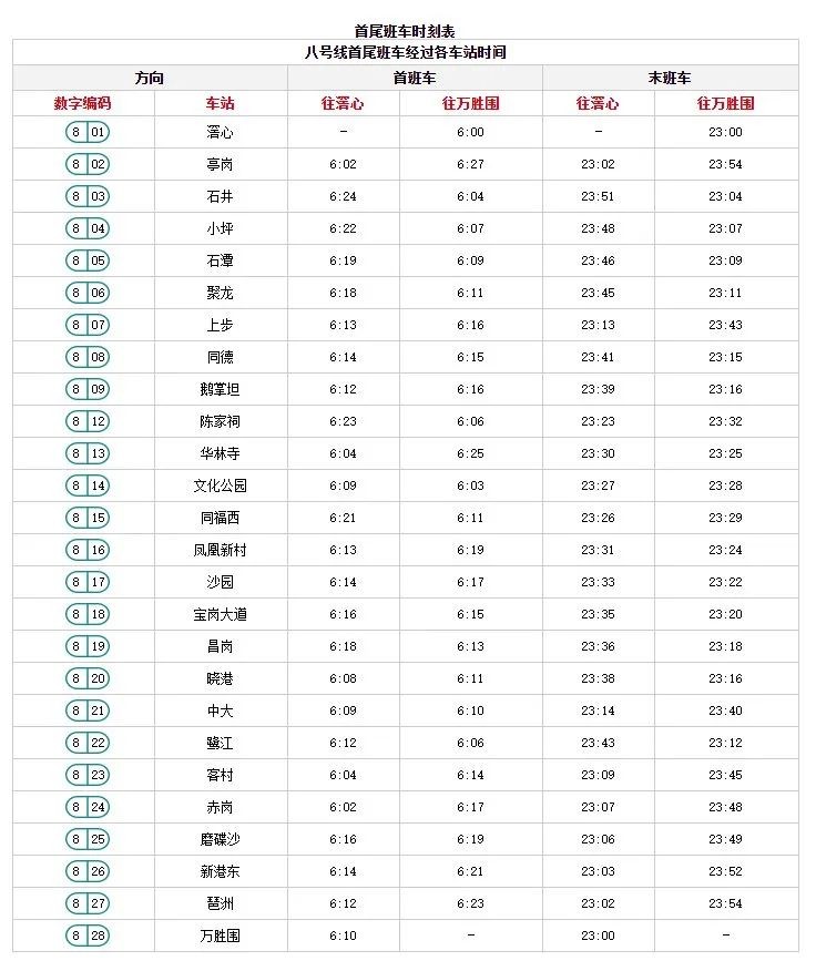 地铁线网各线路首末班车时间表