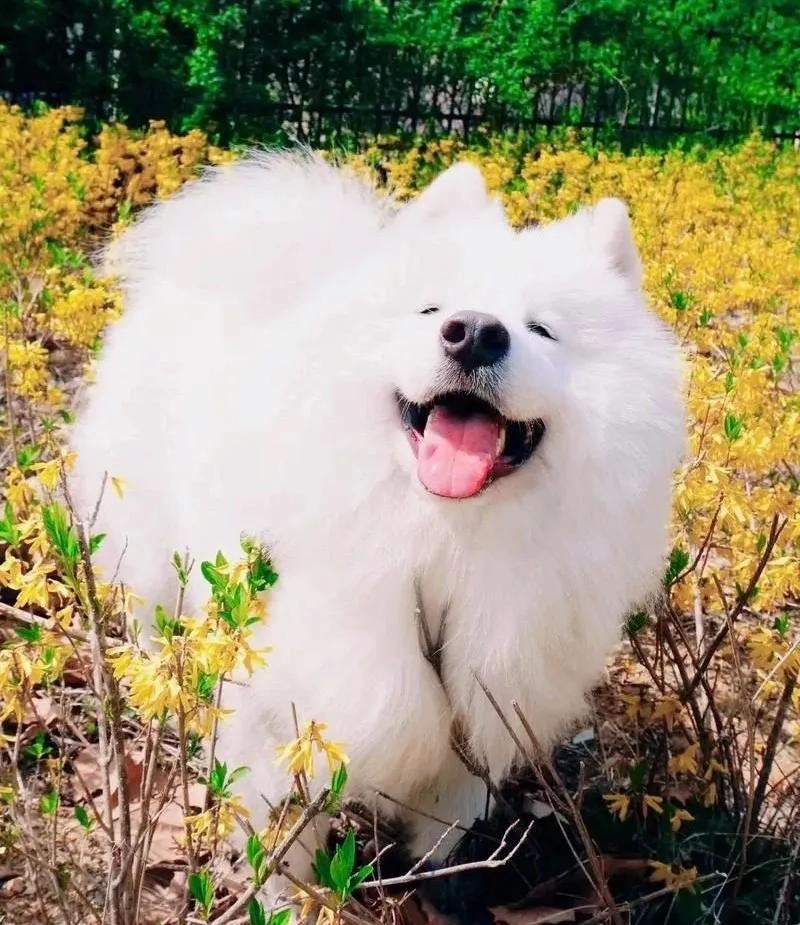 萨摩耶长得像个会移动的棉花糖,一身毛白得像刚下的雪,松松软软的,还带着亮光。
