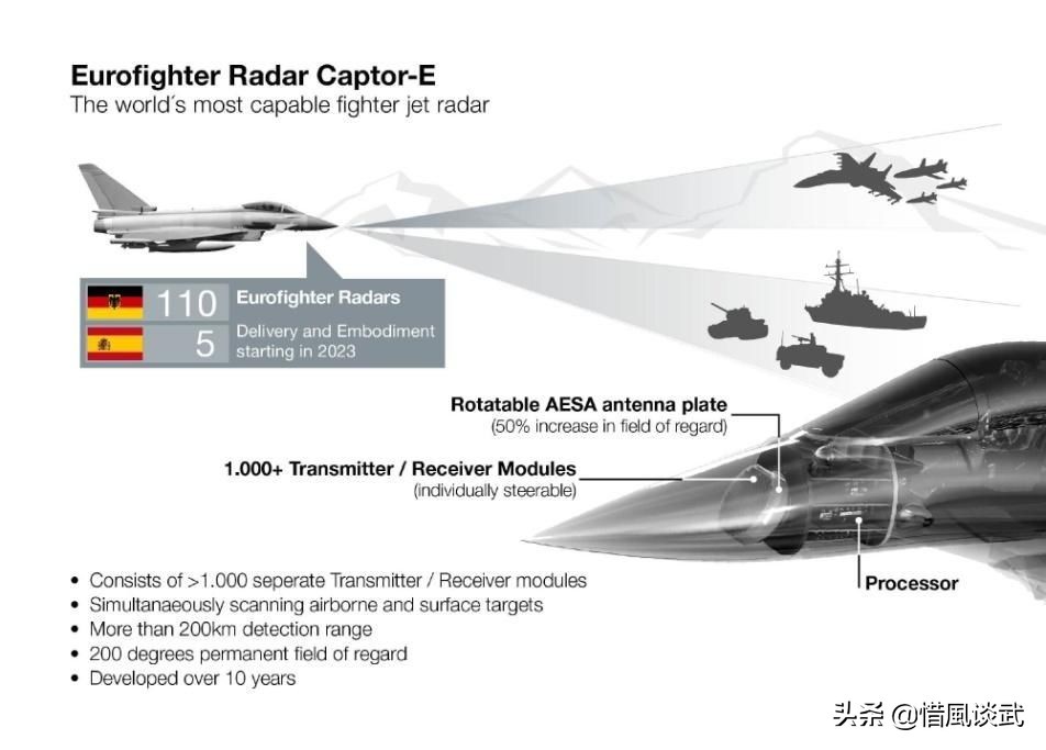 英国台风战斗机装备的“捕手-E”有源相控阵雷达,T/R组件1400个,该雷达探测5㎡的空中目标时,最大发现距离约210km。