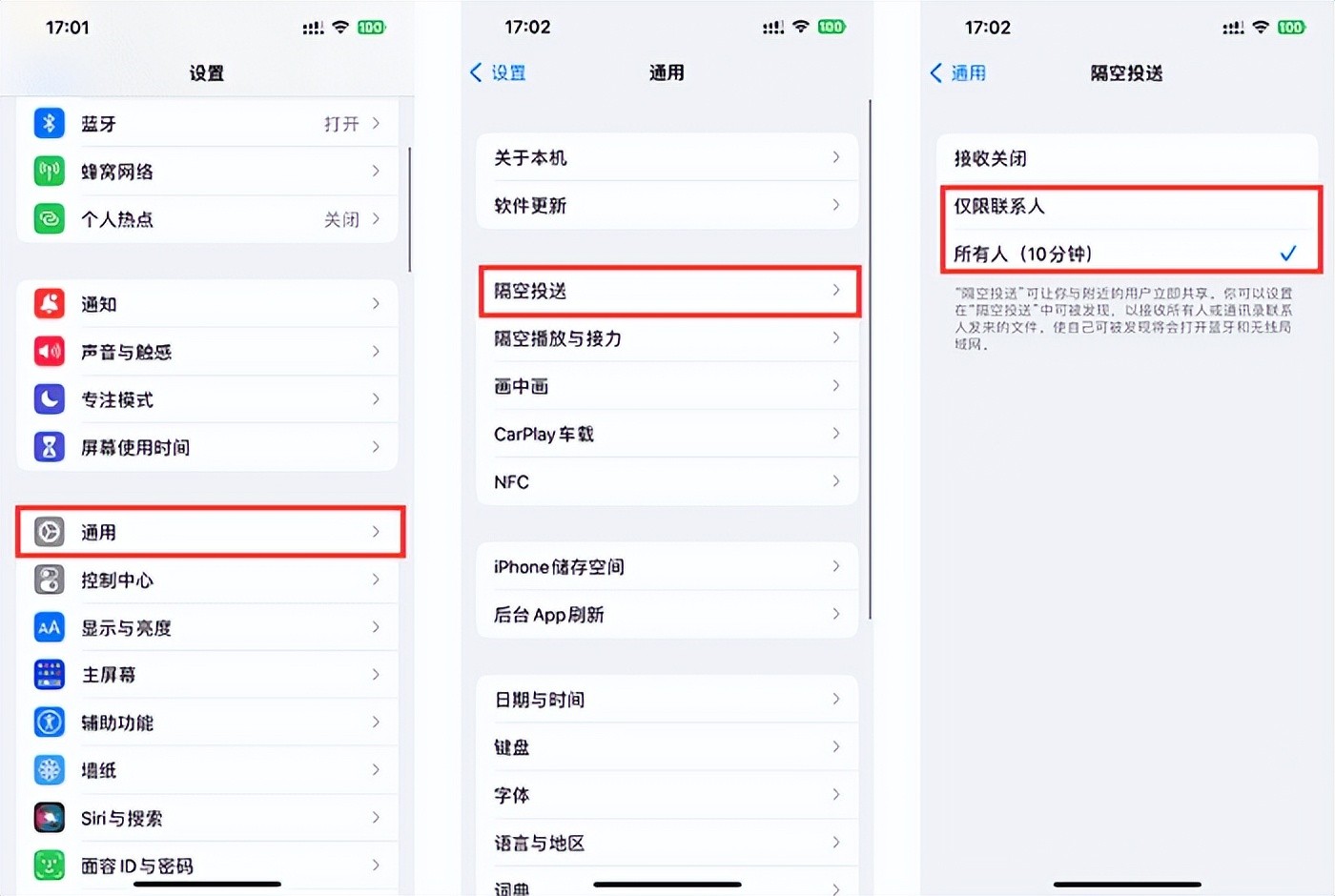 依次打开手机的【设置】—【通用】—【隔空投送】,将其设置为【仅限联系人】或者【所有人】,只有这样才能接收别人投送的信息。