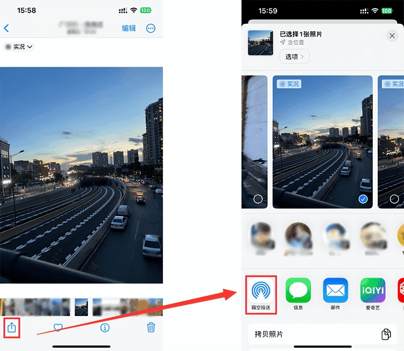 第2步:在弹出窗口中选择【隔空投送】,接着页面会弹出附近的联系人,点击用户即可进行照片传输。