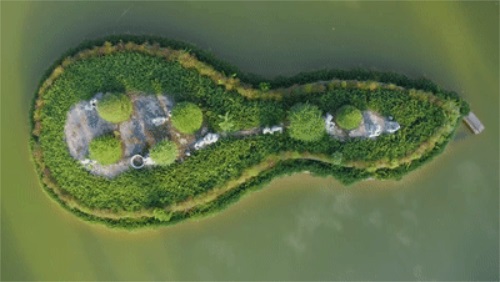 在杜康河中央,一座形如葫芦的小岛清晰可见,如同一颗明珠镶嵌在河中央。这便是我们本期探秘的主角——葫芦岛。