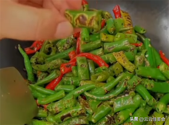 接下来锅里不要加油,先放辣椒干炒,全程一定要小火,用锅铲不停的翻炒,把辣椒表面炒出虎皮,这样会出现一种糊辣椒的特殊香味。
