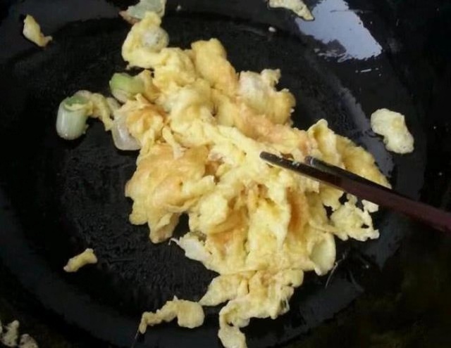 起锅烧油,油温五成热下入鸡蛋炒至金黄,熟透捞出备用。