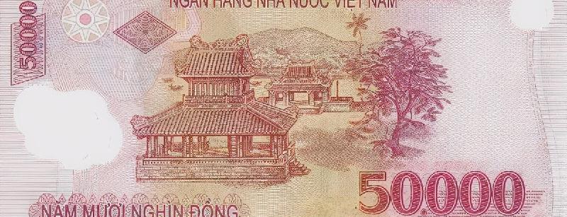 50,000盾的背面是越南古都顺化的皇宫建筑,迎凉亭和夫文楼,建于阮朝,是当时皇家乘龙船游览香江之前歇脚和乘凉之地。顺化历史上曾先后为阮主、西山朝和阮朝的京城,是越南的古都,以历史古迹着称。