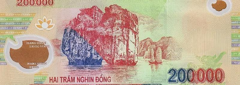 200,000盾背面是世界自然遗产,有“海上桂林”之称的越南下龙湾。下龙湾是位于越南东北部,被广宁省下龙市和海防市葛海县所夹的。