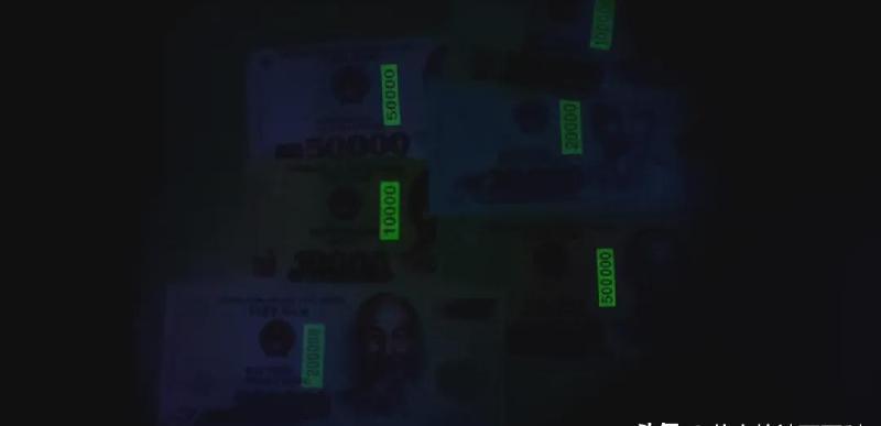 5、高面额的10万20万和50万上面有变色油墨印刷的图案。倾斜钞票角度会由金色变成绿色。