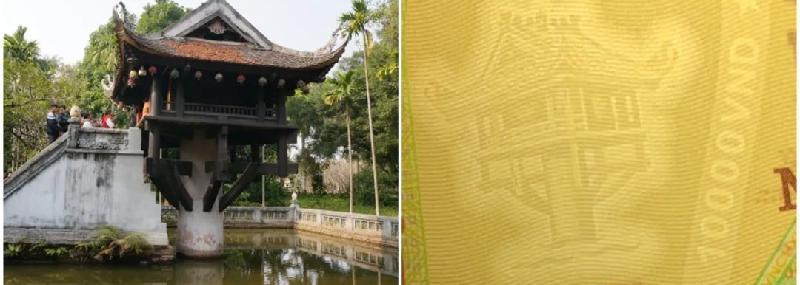 另外,在10000盾上还有一个建筑,就是这个水印图案,这个是叫独柱寺,位于越南河内,紧连胡志明故居,是越南独具一格的名胜古迹之一。