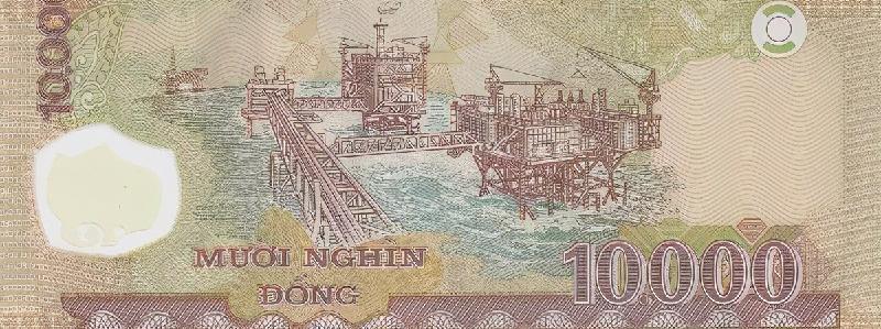 10000盾的图案是海上石油钻井平台,这个图案来自越南最大的油田——白虎油田,白虎油田在1986年开始供应原油,使越南成为东亚主要的石油生产国之一。